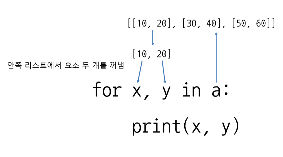 x, y = a[i] # 리스트의 요소 두개를 담는다.